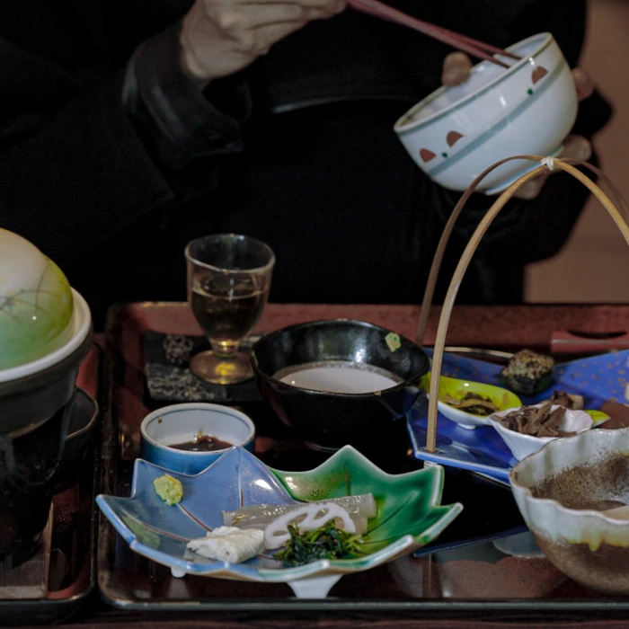 Experience Shojin Ryori (Buddhist vegetarian dishes) & Mountain Cuisine, crafted from wild vegetables and spring water, served in places like Sanrakuso on Mount Daisen.